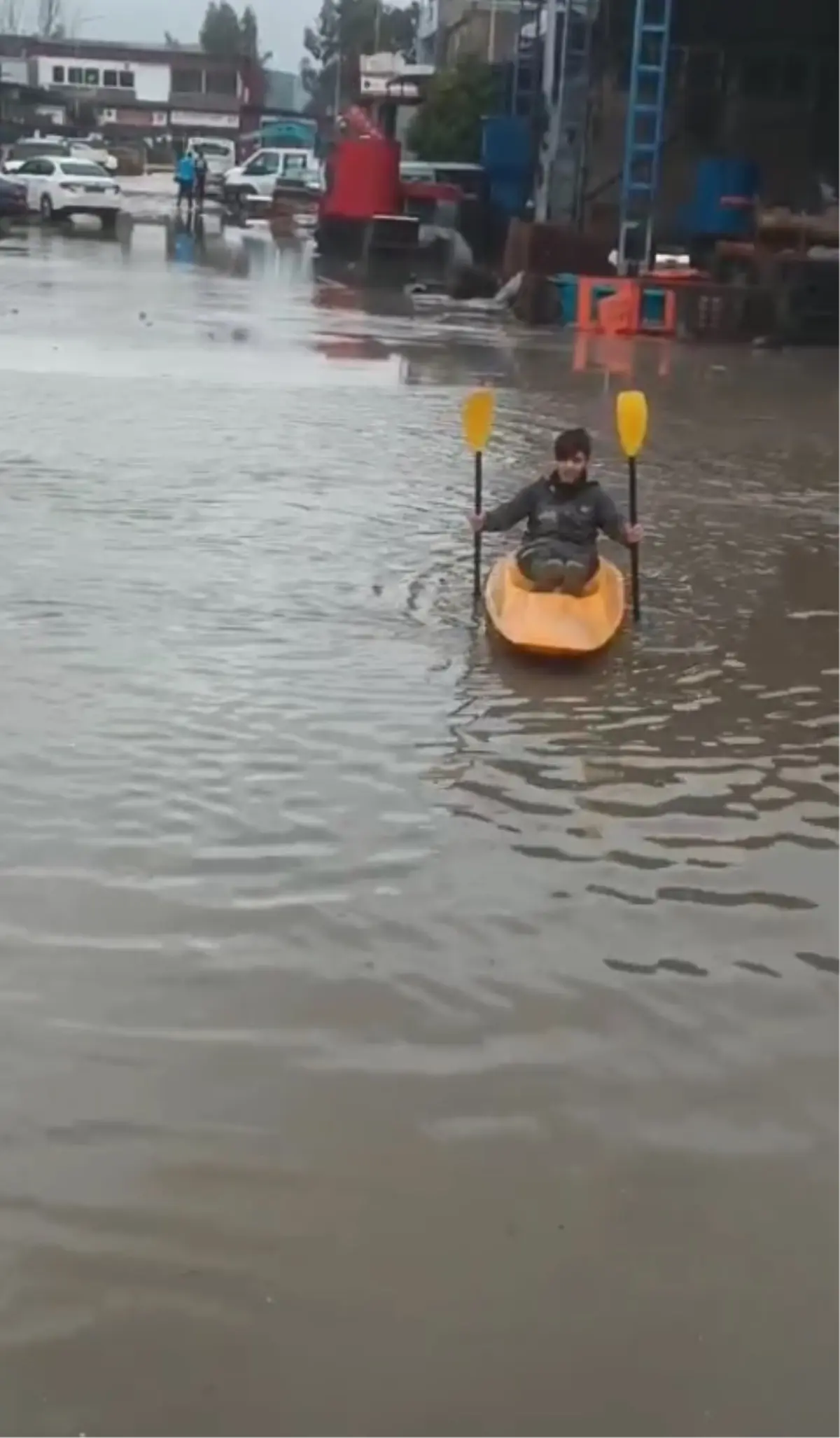 Adana'da şiddetli yağışların ardından oluşan su birikintilerinde bir vatandaş, altyapı sorunlarına dikkat çekmek amacıyla kano ile gezdi.