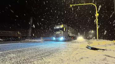 Düzce ilinin batı Karadeniz Bağlantı Yolu (D-655) üzerinde yoğun kar yağışı, sürücüleri yavaşlatıyor. Yolun bazı kesimlerinde kar birikintileri oluştu ve araçların hızı doğal olarak düşüyor.
